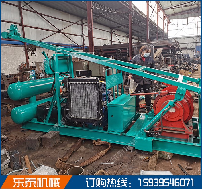 该款是定做的4立方空压洗井机,深水井洗井机200米水井钻机,用来淘井洗井,打捞井内杂物,砖头,石头,水泵,这个架子做的是一个折叠的架子,也可以用来拉活塞,空压机产气经过气包储存,达到5个压力自动放气,通过一根气管输送到井下,把井下的水和泥搅浑,当井内的压力大于井外压力的时候,泥浆会往上翻,这个时候通过铁管直接顶上来,把井内的浑水替换掉,再渗入新水,达到一个清洗的目的,也可以根据要求改装在履带上或是直接做在车上。