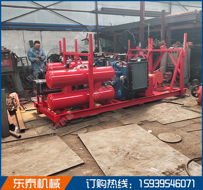 该款是4立方空压洗井机也叫2OO米水井清洗机器或是百米水井清洗机,是好用的水井清理机器,有电机型的和柴油机型的两款,如果客户用电方便可以选用电机型的,4立方是22千瓦电机带的4杠机器,柴油机的话是41OO的柴油机,牵引式的架子装上轮胎可以拉着走,空压机产气经过气包储存,通过一根气管输送到井下,把井下的水和泥搅浑再通过一根铁管冲上来,把井内的淤泥替换掉,完成一个清洗过程。
